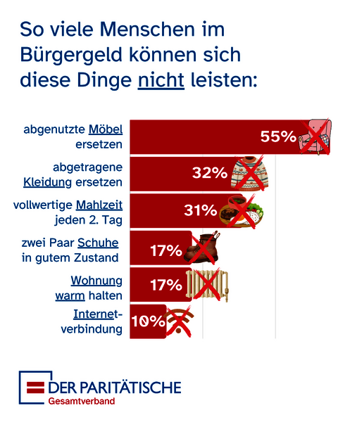 Die Studie des Paritätischen Gesamtverbandes zeigt: Fast jeder Fünfte hat kein zweites Paar Schuhe. Jeder Dritte kann sich keine vollwertige Mahlzeit jeden zweiten Tag leisten. Mehr als die Hälfte kann kaputte Möbel nicht ersetzen. Dies geschieht trotz Tafeln und Sozialkaufhäusern – und während die Bundesregierung stärkere Sanktionen für Leistungsberechtige plant.