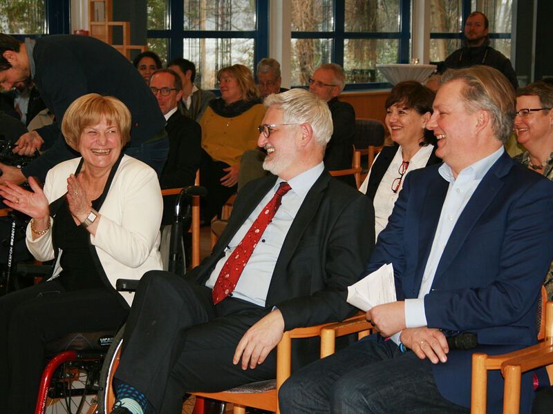 Matthias Platzeck, Ministerpräsident a.D. und langjähriger Schirmherr der DMSG, Jürgen Dusel, Beauftragter der Bundesregierung für die Belange von Menschen mit Behinderungen und chronisch Kranke, Susanna Karawanskij, Ministerin für Arbeit, Soziales, Gesundheit, Frauen und Familie des Landes Brandenburg, Jdith Haas, Vorsitzende DMSG Bundesverbandes, Mike Schubert, Oberbürgermeister der Stadt Potsdam und Andreas Kaczynski, Vorstandsvorsitzender des Paritätischen Landesverbandes bedankten sich herzlich in ihren Grußworten bei Marianne Seibert für ihr Lebenswerk. "Das Ehrenamt ist der Kit unserer Gesellschaft" hob Matthias Platzeck hervor "Wo vermeintlch nur noch das Geld zählt, macht das Ehrenamt das Leben aus."