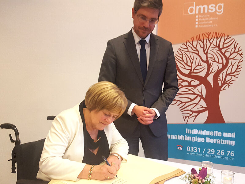 Oberbürgermeister Mike Schubert lud Marianne Seibert ein, sich ins Goldene Buch der Landeshauptstadt Potsdam einzutragen, welchem sie gerne nachkam. Die langjährige Vorsitzende der DMSG wurde für ihr unermüdliches Engagement für Menschen mit Multiple Sklerose geehrt. Die seit 1984 selbst an MS erkrankte, arbeitet seit 35 Jahren ehrenamtlich für MS-Betroffene. Als Vorreiterin baute sie die MS-Selbsthilfe in und um Potsdam auf und gründete 1990 den Landesverband Ost in Berlin und Brandenburg, dessen Vorsitzende sie heute noch ist. "Noch in den 1990er Jahren lag kaum Wissen über die Erkrankung MS vor und Betroffene wurden weitestgehend sich selbst überlassen." so Seibert