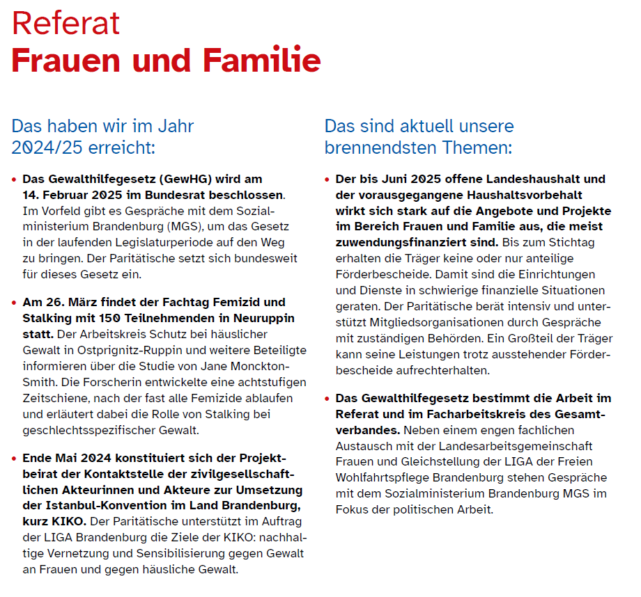 Die bundesgesetzlich pflichtige und komplexe Beratung von Frauen und Familien vor, während und nach der Schwangerschaft ist in Brandenburg unterfinanziert und führt zur Unterversorgung von Ratsuchenden. Der Paritätische engagiert sich intensiv in der LIGA Brandenburg zur Verbesserung der Situation. Iim Frühjahr 2025 wurden im Vorfeld des Landeshaushaltsbeschlusses viele Gespräche mit Landtagsabgeordneten und dem Ministerium für Gesundheit und Soziales geführt. Zudem wurden öffentlichkeitswirksame Pressekonferenzen und Kampagnen durchgeführt. Für den Landeshaushalt 2025/26 konnten bisher keine signifikanten Finanzierungssteigerungen erreicht werden. Die LIGA Brandenburg arbeitet strategisch an diesem Thema weiter, damit Betroffene und Ratsuchende ausreichend und qualitativ beraten und unterstützt werden.
