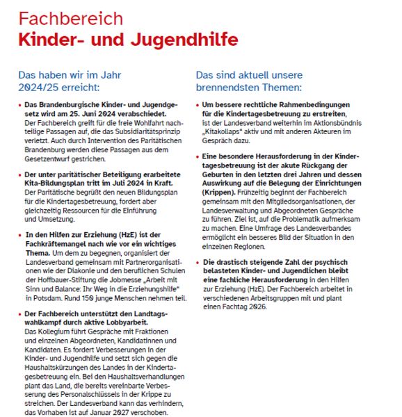 Im zurückliegenden Jahr hat das Referat Kinder- und Jugendhilfe die politische Interessenvertretung für die Hilfen zur Erziehung (HzE) konsequent ausgebaut. Ein zentrales Ergebnis ist die Verabschiedung des Brandenburgischen Kinder- und Jugendgesetzes am 25. Juni 2024. Durch frühzeitige Stellungnahmen, Fachgespräche und eine enge Allianz mit anderen Spitzenverbänden konnten wir mehrere Passagen streichen lassen, die das Subsidiaritätsprinzip zugunsten kommunaler Eigenleistung verwässert hätten. Parallel dazu standen die Folgen des Fachkräftemangels im Mittelpunkt. Gemeinsam mit der Diakonie und den beruflichen Schulen der Hoffbauer-Stiftung organisierten wir die Jobmesse „Arbeit mit Sinn und Balance: Ihr Weg in die Erziehungshilfe“. Das Format verband Beratung und Information zu den Einstiegs- und Karrieremöglichkeiten im Arbeitsfeld der erzieherischen Hilfen ebenso wie Workshops mit praxisnahen Impulsen, Austauschmöglichkeiten mit erfahrenen Fachkräften und eine Jobbörse mit potenziellen Arbeitgeber:innen; Teilnehmende aus ganz Brandenburg konnten so erreicht werden.