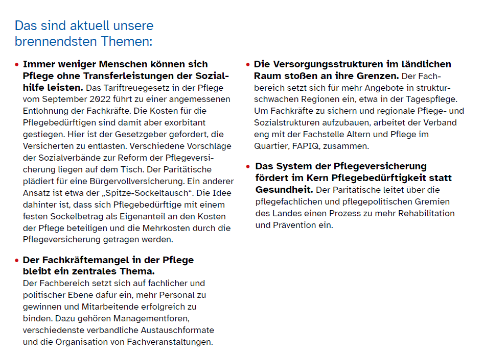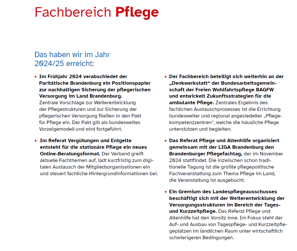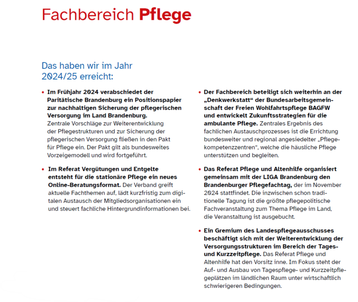 Mittelpunkt des Brandenburger Pflegefachtages 2024 mit dem Titel „Zukunftsfeste Pflege - Haltungswandel in der professionellen und nicht professionellen Pflege“ war es, ein Resümee des vorläufig auslaufenden Pakts für Pflege zu ziehen. Im Ergebnis bedarf es einer stärkeren interdisziplinären Zusammenarbeit in der Pflege- und Gesundheitsversorgung, den Ausbau präventiver und rehabilitativer Angebote, einer fachlich-inhaltlichen Aufwertung des Pflegeberufs und der Weiterentwicklung der Kommunen zu sorgenden Gemeinschaften im Sinne von „Caring Communities“. Im Wesentlichen spiegeln die Tagungsergebnisse, die Inhalte des Paritätischen Strategiepapiers zur Weiterentwicklung der Versorgungsstrukturen aus dem Frühjahr 2024 wider.