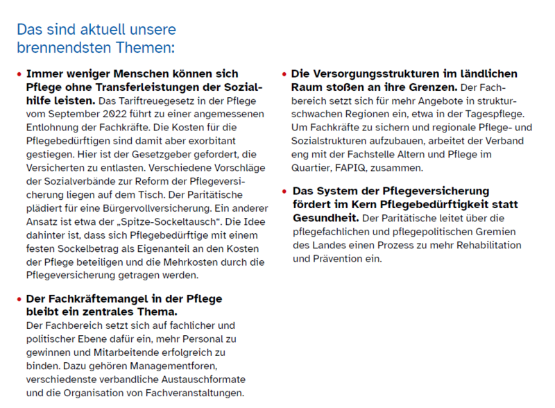 Die Neuausrichtung der Pflege zu mehr Prävention, Kooperation und Koordination ist ein Kernelement des “Paktes für Pflege”. Der Paritätische ist einer der zentralen Impulsgeber in der Weiterentwicklung pflegerischer Strukturen. Das Referat hat die Federführung im Ausschuss “Tages- und Kurzzeitpflege” des Landespflegeausschusses. Ziel ist es, über eine Nebenstellenregelung Tagespflege auch in unterversorgten, sehr ländlichen Regionen zu etablieren. Die neuen vertraglichen Regelungen sollen auch Kurzzeitpflege und Tagespflege zu einer Verbundeinrichtung in modellhaften Gesamtversorgungsverträgen zusammenführen.